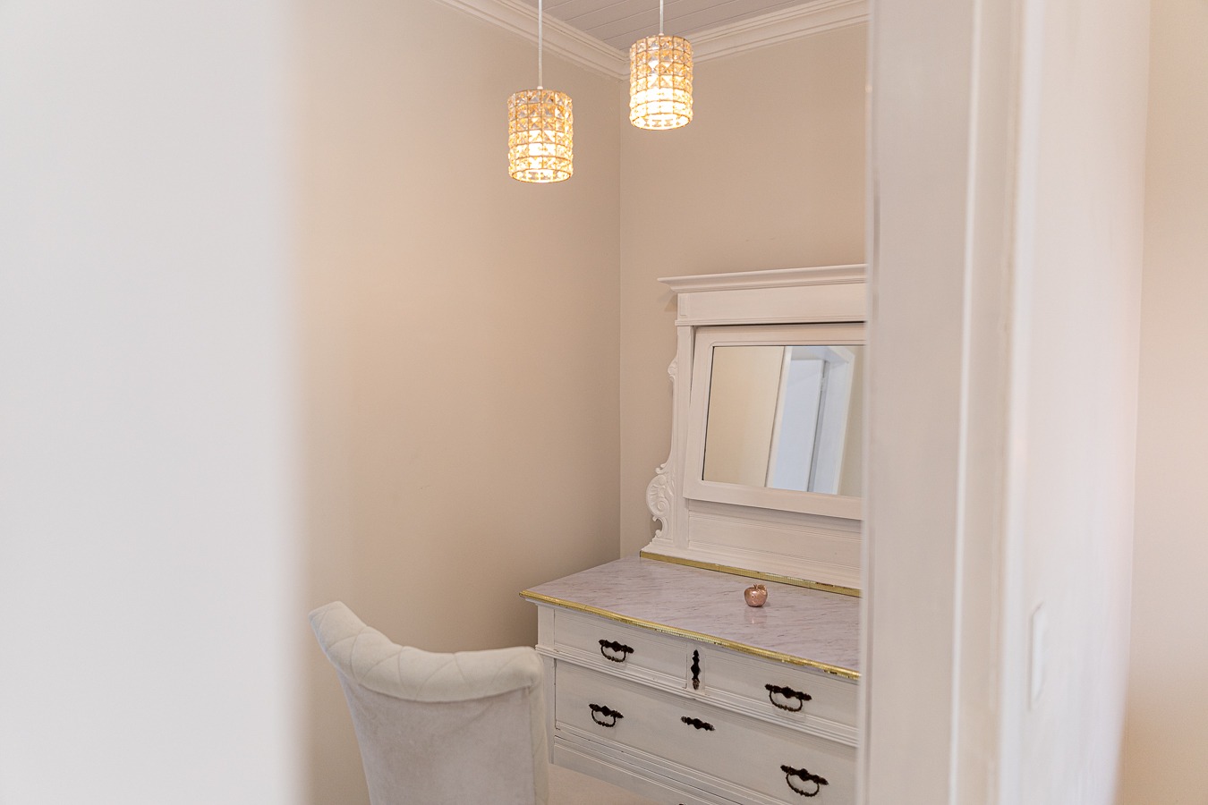 Espaço beauty com penteadeira e iluminação para maquiagem e penteado. Ambiente amplo, sofisticado e climatizado, com cama king-size, enxoval premium e iluminação suave, ideal para sessões de fotos e vídeos de making of.