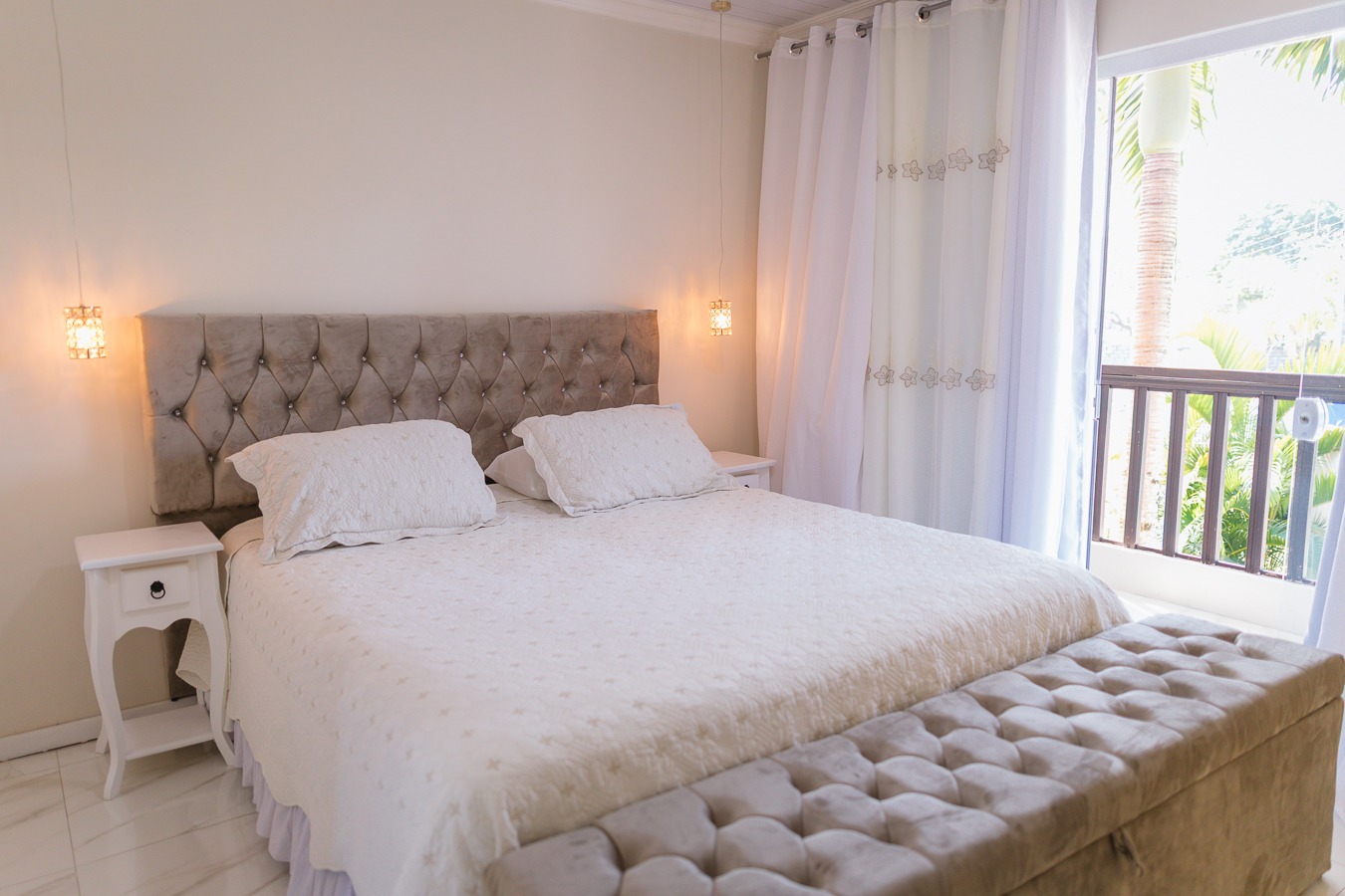 Suíte com cama king size + 1 camas de solteiro, cozinha completa, fogão a gás, e sacada privativa com churrasqueira a carvão com vista para o jardim.